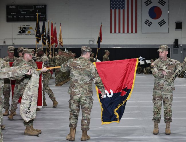 12일 오전 경기도 동두천시 캠프 케이시에서 열린 미2사단/한미 연합사단 순환 배치 부대 임무 교대식에서 미2사단 제2스트라이커 전투여단이 부대기를 펼치며 임무 시작을 알리고 있다. 이날 미4사단 제1스트라이커 전투여단과 교대한 이들은 9개월 동안 한반도에서 임무를 수행한다. 동두천=양회성 기자 yohan@donga.com 12일 오전 경기 동두천시 캠프