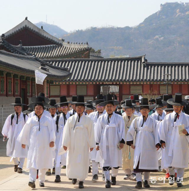 행사를 마친 재현단 후학들이 경복궁 사정전을 빠져나오고 있다. 이훈구 기자 ufo@donga.com 봄 햇살이 제법 따스해진 27일 오후 서울 경복궁 근정전 뒤. 관직과 부귀영화를 애써 조심하고 멀리 했던 옛 선비의 발자취를 체험하는 행사가 시작되는 날. 오전부터 옛 선비 옷을 입은 후학들의 움직임도 분주했습니다. 먼저 도산서원선비문화수련원 합창단의 축하