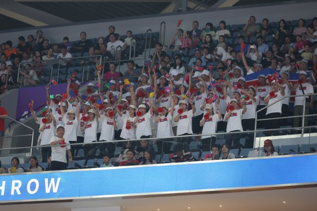 인공기가 새겨진 티셔츠를 입은 북한 응원단이 북한을 응원하고 있다. 한가위인 29일 저녁 여자농구 대한민국과 북한과의 맞대결에 북한 여자응원단이 등장했다. 인공기를 든 북한 선수들이 북한을 응원하고 있다. 태극기를 든 한국응원단이 북한 선수들에게 박수를 보내고 있다. 이들은 인공기가 새겨진 티셔츠와 하얀모자를 착용했다. 그리고 손에는 응원도구를 들고 북한을