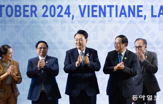 윤석열 대통령이 10일(현지시간) 라오스 비엔티안 국립컨벤션센터(NCC)에서 열린 한·아세안(ASEAN·동남아시아국가연합) 정상회의에서 손싸이 시판돈 라오스 총리 등과 기념촬영을 하고 있다. 송은석 기자 silverstone@donga.com 윤석열 대통령이 10일 라오스 비엔티안 국립컨벤션센터(NCC)에서 열린 한-아세안(ASEAN·동남아시아국가연합) 정