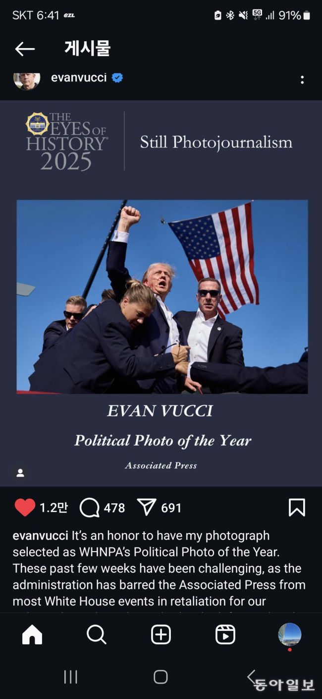 에반 부치 기자는 지난 3월 초, 다시 트럼프를 제대로 찍고 싶다고 자신의 인스타그램에 수상 소감 삼아 올렸다. 네탄야후 이스라엘 총리가 7일(현지시간) 백악관을 방문했을 때 미국 AP통신의 사진에는 뭔가 중요한 게 빠져 있었다. 두 사람이 정상회담을 하기 위해 오벌 오피스에 앉아 있는 모습 말이다. AFP와 UPI 등 다른 통신사들의 사진에는 당연히 두