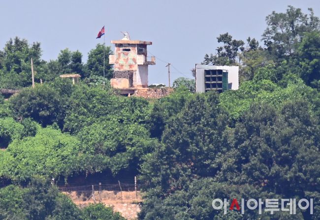 아시아투데이 송의주 기자 = 우리 군의 대북 확성기 철거에 북한이 호응하면서 전방 일부 지역에서 대남 확성기를 철거하기 시작했다. 우리 군이 지난 4∼5일에 걸쳐 대북 확성기를 모두 철거한 데 대해 화답한 것이다. 사진은 10일 경기도 파주 접경 지역에서 바라본 북한군 초소와 대남 방송 스피커. ⓒ "젊은 파워, 모바일 넘버원 아시아투데이"