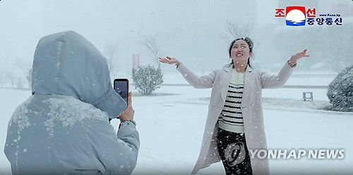 (평양 조선중앙통신=연합뉴스) 지난 4일 평양에 첫눈이 내린 가운데 한 여성이 양팔을 벌리고 포즈를 취하며 동료가 휴대전화로 촬영하고 있다. 이날 평양 지역 강설량은 평균 9cm를 기록했다고 조선중앙통신이 5일 보도했다. 2025.12.5 [국내에서만 사용가능. 재배포 금지. For Use Only in the Republic of Korea. No Red