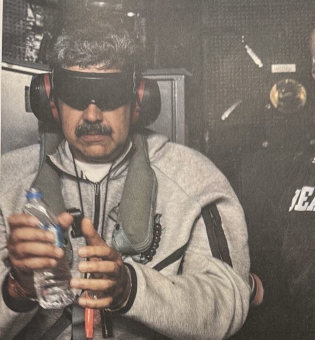 도널드 트럼프 미국 대통령이 3일(현지 시간) 소셜미디어 ‘트루스소셜’을 통해 공개한 니콜라스 마두로 베네수엘라 대통령의 국외 이송 모습. 트럼프 대통령은 ‘니콜라스 마두로가 USS 이오지마 함에 탑승해 있다’라는 글과 함께 사진을 게재했다. 뉴스1 미국이 니콜라스 마두로 베네수엘라 대통령을 축출한 데 대해 북한 당국은 나흘째 북한 주민들에게 관련 소식을