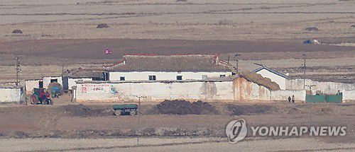 (인천=연합뉴스) 임순석 기자 = 11일 인천 강화군 강화평화전망대에서 바라본 북한 황해북도 개풍군 마을에 인공기와 주민들이 보인다. 북한 김여정 노동당 부부장은 이날 조선중앙통신 담화를 통해 한국발 무인기가 북한 영공을 침범했다며 책임을 경고했다. 2026.1.11 soonseok02@yna.co.kr ▶제보는 카카오톡 okjebo ▶연합뉴스 앱 지금 바