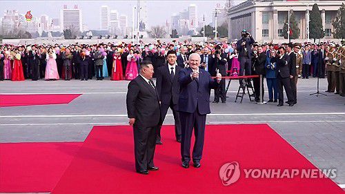 (서울=연합뉴스) 김정은 북한 국무위원장과 알렉산드르 루카셴코 벨라루스 대통령이 지난 25일 평양 김일성광장에서 열린 환영 의식에서 나란히 서 있는 가운데, 루카셴코 대통령이 평양 시민들을 향해 양손 엄지를 치켜세우고 있다. [조선중앙TV 화면] 2026.3.26 [국내에서만 사용가능. 재배포 금지. For Use Only in the Republic of