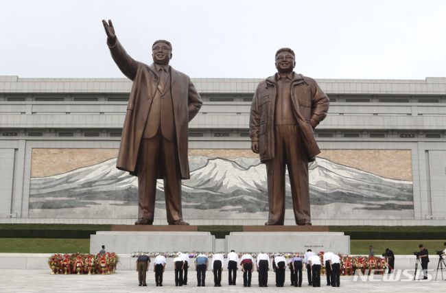 [평양=AP/뉴시스] 김정일 북한 전 국방위원장의 선군정치를 기념하는 '선군절' 62주년을 맞아 25일 평양 만수대언덕을 찾은 시민들이 김일성·김정일 동상에 참배하고 있다. 2022.08.25. [사진 영상 제보받습니다] 공감언론 뉴시스가 독자 여러분의 소중한 제보를 기다립니다. 뉴스 가치나 화제성이 있다고 판단되는 사진 또는 영상을 뉴시스 사진영상부(n-