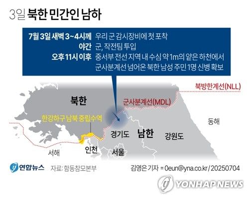 합동참모본부는 지난 3일 밤 중서부 전선에서 군사분계선(MDL)을 넘어오는 북한 주민 1명의 신병을 확보했다고 4일 밝혔다. 합참은 "군은 MDL 일대에서 해당 인원을 식별해 추적·감시했고, 정상적인 유도 작전을 실시해 신병을 확보했으며, 세부 남하 과정에 대해서는 관계기관에서 조사 예정"이라고 밝혔다. 합참은 “현재까지 북한군의 특이동향은 없으며, 유엔군