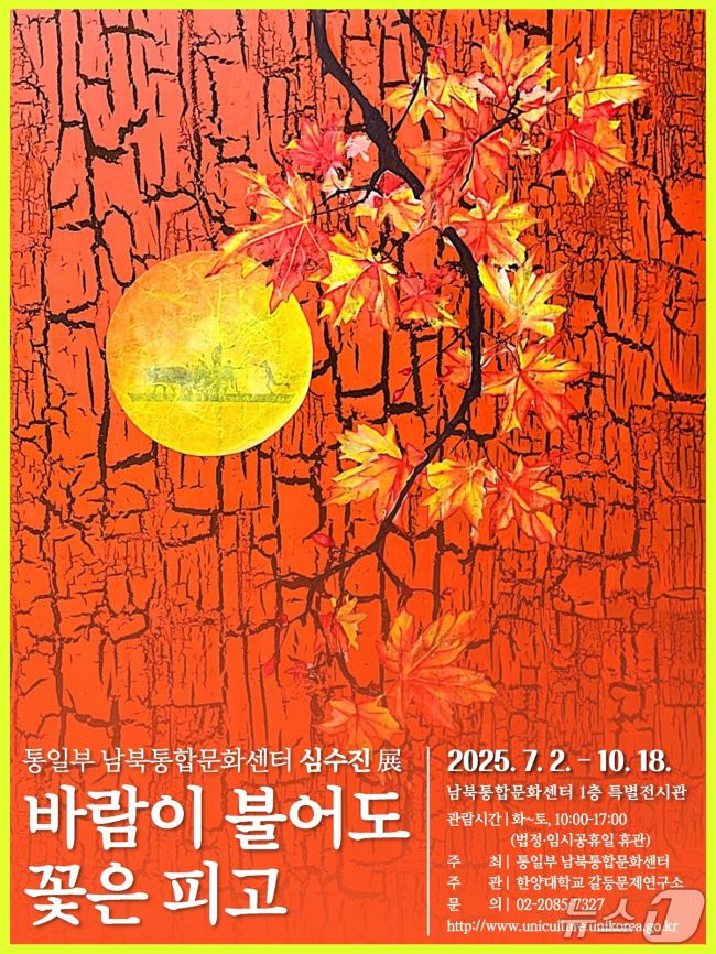 북한이탈주민 화가 심수진의 전시.(통일부 제공). (서울=뉴스1) 김예슬 기자 = 통일부 남북통합문화센터가 북한이탈주민 화가 심수진의 전시 '바람이 불어도 꽃은 피고'를 지난 2일부터 오는 10월 18일까지 센터 1층 특별전시관에서 진행한다고 8일 밝혔다. 함경남도 출신의 심수진은 2007년 한국에 입국한 뒤 병마와 싸우면서도 도자기·낙엽·한지 등 다양한