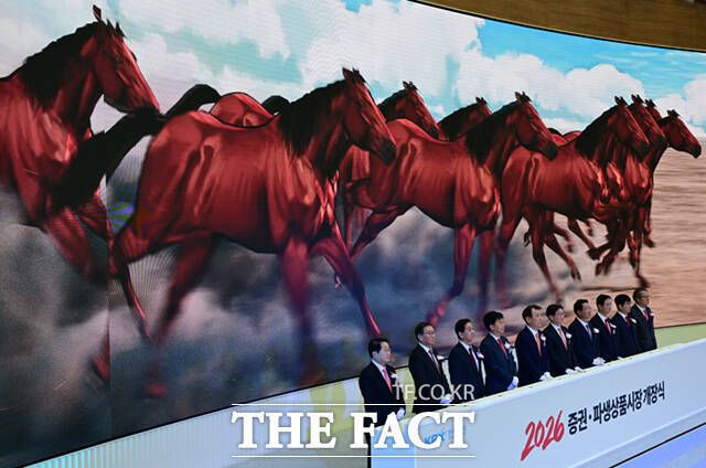 2일 증권·파생상품시장 개장식 정은보·이억원·이찬진·황성엽 등 기관 수장 총집결 거래시간 연장·가상자산 ETF 출시 등 예고도 정은보 한국거래소 이사장(왼쪽에서 다섯 번째) 등 금융 당국 기관장들과 참석자들이 2일 서울 영등포구 여의도 한국거래소 서울사무소에서 열린 2026년도 증권·파생상품시장 개장식에서 개장신호식을 하고 있다. /이새롬 기자 붉은 말의