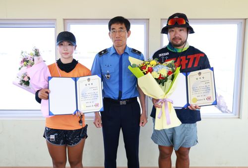 바다에 빠진 4남매 구조한 해양재난구조대원에 감사장 [제주해양경찰청 제공, 재판매 및 DB 금지] (제주=연합뉴스) 변지철 기자 = 제주지방해양경찰청은 바다에 빠진 4남매를 구조한 해양재난구조대원 2명에게 감사장을 수여했다고 14일 밝혔다. 수상레저업체 직원이자 해양재난구조대원으로 활동하는 윤태완(37)씨와 채은지(22)씨는 지난 9일 오후 제주시 조천읍