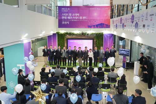 지난해 12월 1일 열린 한일 제주 스타트업 펀드 결성식 [제주도 제공. 재판매 및 DB 금지] (제주=연합뉴스) 전지혜 기자 = '한일 제주 스타트업 펀드'에 출자한 재일제주인들이 중소벤처기업부 장관 감사패를 받았다. 25일 제주도에 따르면 전날 오후 일본 도쿄에서 열린 재일본 관동제주도민협회 신년인사회에서 오영훈 제주지사는 중기부 장관을 대신해 한일 제