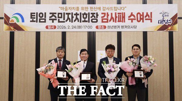 오정·회덕·신탄진동 3명 대상 주민 참여 확대·마을자치 활성화 공로 최충규 대덕구청장(왼쪽 세번째)과 이규영 오정동 주민자치회장, 이형주 회덕동 주민자치회장, 홍석표 신탄진동 주민자치회장이 24일 '감사패 수여식'을 마친 후 기념 촬영을 하고 있다. /대덕구 대전시 대덕구가 퇴임 주민자치회장 3명에게 감사패를 수여했다. 구는 청년벙커의사당에서 지난 24일