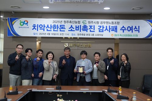 이승호 원공노 대변인, 원주축협으로부터 감사패 받아 [원공노 제공.재판매 및 DB 금지] (원주=연합뉴스) ▲ 원공노 대변인, 원주축협으로부터 감사패 받아 = 원주시청 공무원노동조합은 이승호 대변인이 원주 생산 한돈 홍보와 축산 농가 지원에 이바지한 공로로 축협으로부터 감사패를 받았다고 16일 밝혔다. 신동훈 원주축협 조합장은 "축산농가를 위해 원주 생산
