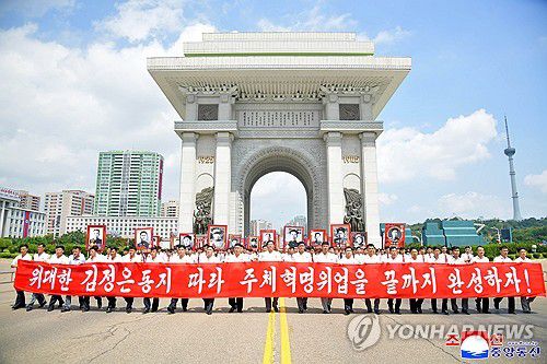 (평양 조선중앙통신=연합뉴스) 북한은 지난 15일 평양 개선문 광장에서 조국해방(광복) 80주년을 맞아 웅변모임 및 시위행진을 했다고 조선중앙통신이 16일 보도했다. 2025.8.16 [국내에서만 사용가능. 재배포 금지. For Use Only in the Republic of Korea. No Redistribution] nkphoto@yna.co.kr