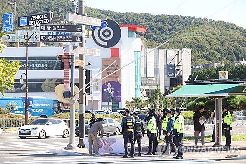 (경주=연합뉴스) 박세진 기자 = 28일 2025 경주 아시아태평양경제협력체(APEC) 정상회의장 앞에서 미국 정부의 무역 정책을 비판하는 내용과 트럼프 미국 대통령의 모습이 담긴 현수막을 펼치며 기습 1인 시위를 한 이제석 이제석광고연구소 대표가 경찰에 제지당하고 있다. 2025.10.28 psjpsj@yna.co.kr ▶제보는 카카오톡 okjebo ▶연