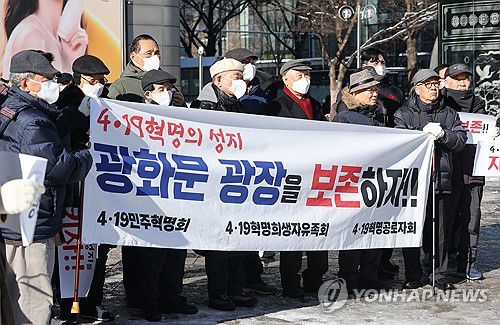 (서울=연합뉴스) 류영석 기자 = 4·19민주혁명회, 4·19혁명희생자유족회, 4·19혁명공로자회 회원들이 5일 서울 종로구 동화면세점 앞에서 서울시가 조성 중인 광화문광장 '감사의 정원' 조형물 설치 반대 집회를 하고 있다. 2025.12.5 ondol@yna.co.kr ▶제보는 카카오톡 okjebo ▶연합뉴스 앱 지금 바로 다운받기~ ▶네이버 연합뉴스