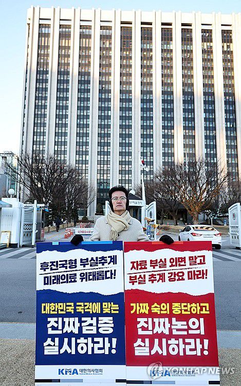 (서울=연합뉴스) 김인철 기자 = 8일 서울 종로구 정부서울청사 앞에서 좌훈정 대한의사협회 부회장이 의사 수급추계 결과 발표와 관련해 1인 시위를 하고 있다. 2026.1.8 yatoya@yna.co.kr ▶제보는 카카오톡 okjebo ▶연합뉴스 앱 지금 바로 다운받기~ ▶네이버 연합뉴스 채널 구독하기 <저작권자(c) 연합뉴스, 무단 전재-재배포, AI 학