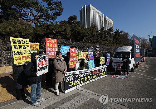 (서울=연합뉴스) 김성민 기자 = 홈플러스 물품구매전단피해자 비상대책위원회가 27일 서울 서초구 서울중앙지방검찰청 앞에서 연 김병주 MBK파트너스 회장 등의 구속영장 재청구 촉구 기자회견에서 참가자들이 손팻말을 들고 있다. 2026.1.27 ksm7976@yna.co.kr ▶제보는 카카오톡 okjebo ▶연합뉴스 앱 지금 바로 다운받기~ ▶네이버 연합뉴스