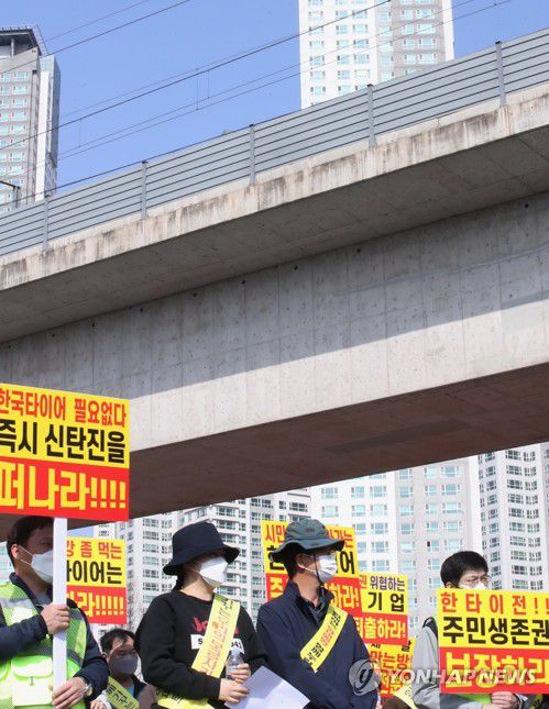 (대전=연합뉴스) 강수환 기자 = 20일 오후 대전 대덕구 목상동 한국타이어 대전공장에 인근 아파트 입주민 100여 명이 모여 한국타이어 공장 화재로 인한 피해를 호소하고 공장 이전을 요구하는 집회를 열고 있다. 지난 12일 밤에 일어난 한국타이어 대전공장에서 난 불이 타이어 21만 개를 태우고 사흘 만에 꺼졌다. 공장 인근 아파트 주민들은 화재로 인한 분