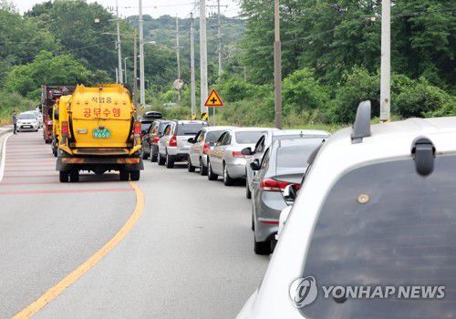 (전주=연합뉴스) 나보배 기자 = 5일 오전 민주노총 공공운수노조 전북평등지부 전주리싸이클링분회가 전주리싸이클링타운 앞에서 집회를 열고 있다. 사진은 노조가 음식물쓰레기 수거 차량의 진로를 방해하기 위해 출입로 양쪽에 주정차해놓은 모습. 2023.6.5 warm@yna.co.kr ▶제보는 카카오톡 okjebo ▶연합뉴스 앱 지금 바로 다운받기~ ▶네이버 연