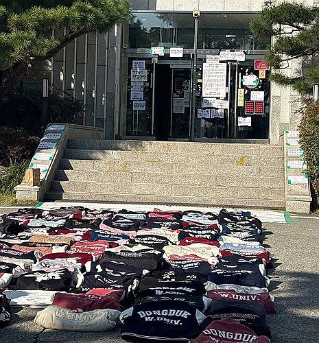 (서울=연합뉴스) 서울 성북구 동덕여자대학교에서 남녀공학 전환을 저지하기 위한 동덕여대 재학생들의 시위가 벌어진 11일 동덕여대 본관 앞에 학생들이 벗어둔 대학 점퍼가 놓여있다. 2024.11.11 [동덕여자대학교 총학생회 제공. 재판매 및 DB 금지] photo@yna.co.kr ▶제보는 카카오톡 okjebo ▶연합뉴스 앱 지금 바로 다운받기~ ▶네이버