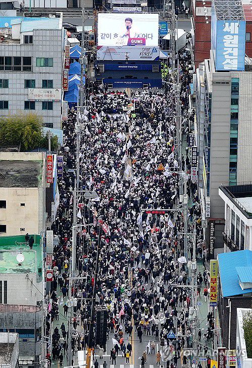 (구미=연합뉴스) 윤관식 기자 = 15일 경북 구미시 구미역 앞에서 세이브코리아 주최 윤석열 대통령 탄핵 반대 집회인 국가비상기도회가 열리고 있다. 2025.3.15 psik@yna.co.kr ▶제보는 카카오톡 okjebo ▶연합뉴스 앱 지금 바로 다운받기~ ▶네이버 연합뉴스 채널 구독하기 <저작권자(c) 연합뉴스, 무단 전재-재배포, AI 학습 및 활용