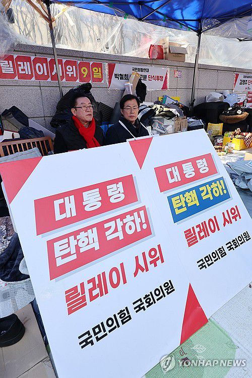 (서울=연합뉴스) 신현우 기자 = 국민의힘 이종배(왼쪽), 이만희 의원이 19일 서울 종로구 헌법재판소 앞에서 윤석열 대통령의 탄핵 각하를 촉구하는 릴레이 시위를 하고 있다. 2025.3.19 nowwego@yna.co.kr ▶제보는 카카오톡 okjebo ▶연합뉴스 앱 지금 바로 다운받기~ ▶네이버 연합뉴스 채널 구독하기 <저작권자(c) 연합뉴스, 무단 전