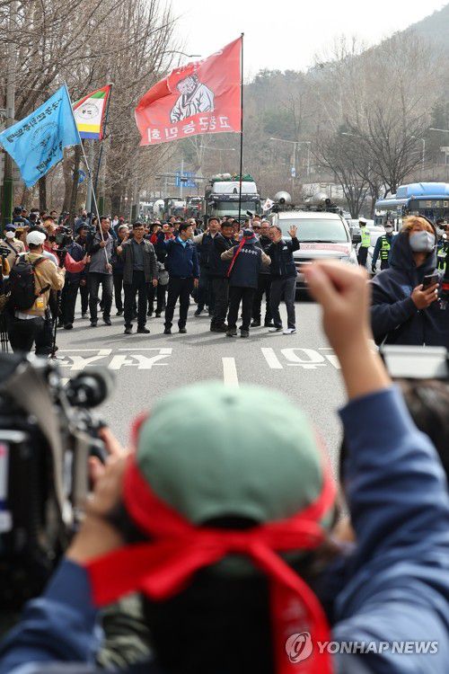 (서울=연합뉴스) 서대연 기자 = 25일 전국농민회총연맹(전농) 회원들이 서울 서초구 남태령고개 일대에서 윤석열 대통령 탄핵을 촉구하며 집회장소로 이동하고 있다. 전농은 이날 집회를 마친 뒤 광화문 방면으로 트랙터 행진할 계획이었으나 법원의 결정으로 불허됐다. 2025.3.25 dwise@yna.co.kr ▶제보는 카카오톡 okjebo ▶연합뉴스 앱 지금