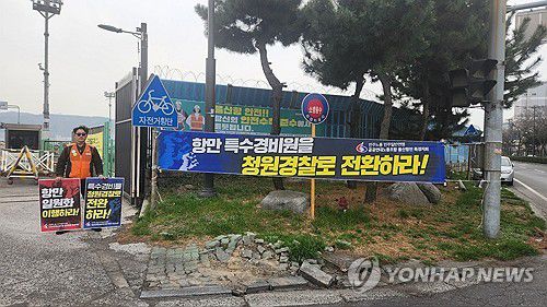 (부산=연합뉴스) 국가항만보안노동조합연맹은 26일 부산, 인천, 여수, 울산에 있는 4대 지방 해양수산청 앞에서 항만 보안직 대표자가 전국 항만 보안 일원화와 청원경찰 전환을 촉구하는 1인 시위를 시작한다고 밝혔다. 사진은 울산해수청 앞에서 1인 시위하는 노조 관계자. 2025.3.26 [국가항만보안노동조합연맹 제공. 재판매 및 DB 금지] psj19@yn