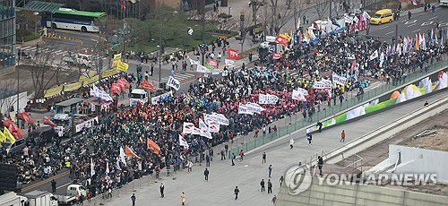 (서울=연합뉴스) 홍해인 기자 = 전국민주노동조합총연맹(민주노총) 소속 조합원들이 27일 서울 세종대로 광화문광장에서 윤석열 대통령에 대한 헌법재판소의 탄핵심판 선고일 지정을 촉구하며 총파업 집회를 열고 있다. 2025.3.27 hihong@yna.co.kr ▶제보는 카카오톡 okjebo ▶연합뉴스 앱 지금 바로 다운받기~ ▶네이버 연합뉴스 채널 구독하기