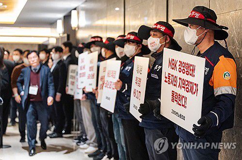 주주총회장 앞에서 시위하는 고려아연 노조원들
