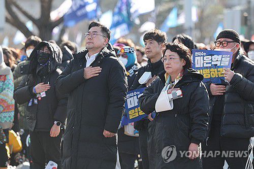 (서울=연합뉴스) 임화영 기자 = 더불어민주당 박찬대 원내대표, 조국혁신당 김선민 대표 권한대행이 29일 서울 종로구 동십자각 인근에서 열린 야5당 대통령 탄핵 촉구 사전집회에서 국기에 경례하고 있다. 2025.3.29 hwayoung7@yna.co.kr ▶제보는 카카오톡 okjebo ▶연합뉴스 앱 지금 바로 다운받기~ ▶네이버 연합뉴스 채널 구독하기 <저