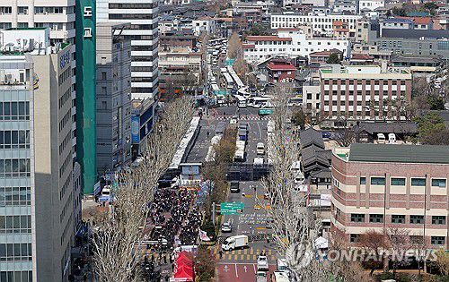 (서울=연합뉴스) 류영석 기자 = 윤석열 대통령 탄핵심판 선고를 하루 앞둔 3일 경찰 차벽이 설치된 서울 종로구 헌법재판소 앞 안국역사거리에서 탄핵 반대 집회가 열리고 있다. 2025.4.3 ondol@yna.co.kr ▶제보는 카카오톡 okjebo ▶연합뉴스 앱 지금 바로 다운받기~ ▶네이버 연합뉴스 채널 구독하기 <저작권자(c) 연합뉴스, 무단 전재-재