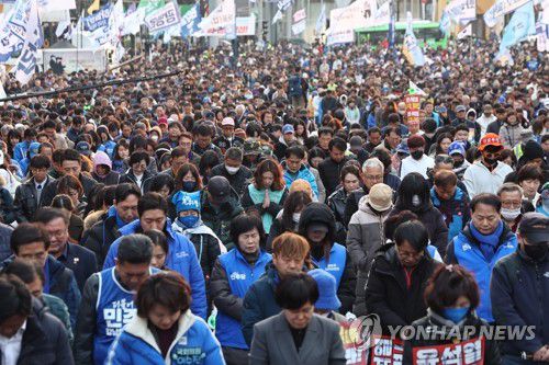 (서울=연합뉴스) 윤동진 기자 = 윤석열 대통령 탄핵심판 선고를 하루 앞둔 3일 서울 종로구 안국역 인근에서 열린 '윤석열 8대0 파면을 위한 끝장 대회'에서 참석자들이 묵념하고 있다. 2025.4.3 mon@yna.co.kr ▶제보는 카카오톡 okjebo ▶연합뉴스 앱 지금 바로 다운받기~ ▶네이버 연합뉴스 채널 구독하기 <저작권자(c) 연합뉴스, 무단