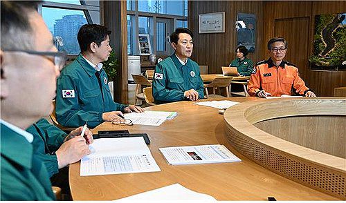(서울=연합뉴스) 오세훈 서울시장이 5일 오전 서울시청 집무실에서 '주말 도심 집회 안전대책회의'를 열어 교통·인파 관리 등 대응계획을 점검하고 있다. 회의에는 행정1·2부시장과 정무부시장을 비롯해 재난안전실, 교통실, 자치경찰위원회, 시민건강국, 소방재난본부, 서울교통공사 등 시민 안전과 편의를 맡고 있는 부서·기관의 실·국·본부장 등이 참석했다. 202