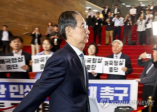 팻말 시위 속 한덕수 권한대행 국회 도착