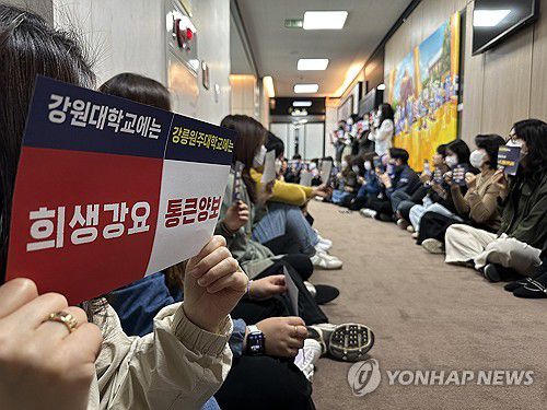 (춘천=연합뉴스) 강태현 기자 = 강원대학교 평의원회가 열린 28일 오전 대학 본부 교무회의실 앞 복도에서 교직원과 학생들이 강릉원주대와의 통폐합 신청서 수정안에 대한 항의 시위를 하고 있다. 2025.4.28 taetae@yna.co.kr ▶제보는 카카오톡 okjebo ▶연합뉴스 앱 지금 바로 다운받기~ ▶네이버 연합뉴스 채널 구독하기 <저작권자(c) 연