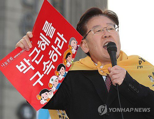 (서울=연합뉴스) 더불어민주당 이재명 대선 후보가 제21대 대통령 당선인으로 확실시되고 있다. 사진은 지난 2016년 12월 3일 촛불집회가 예정된 광화문 인근에서 방송차량에 올라 '박근혜를 구속하라' 손팻말을 들고 연설하는 모습. 2025.6.4 [연합뉴스 자료사진] photo@yna.co.kr ▶제보는 카카오톡 okjebo ▶연합뉴스 앱 지금 바로 다운