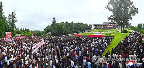 (평양 조선중앙통신=연합뉴스) 북한은 6·25 전쟁 발발일인 지난 25일 전국 각지에서 대규모 군중집회를 열고 미국을 성토하며 적대의식을 고취했다. 조선중앙통신은 26일 "6·25미제 반대 투쟁의 날에 즈음한 군중집회가 25일 역사의 고발장이며 우리 인민의 치솟는 복수심의 발원지인 신천에서 진행"됐다고 보도했다. 2025.6.26 [국내에서만 사용가능. 재