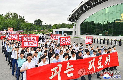 (평양 조선중앙통신=연합뉴스) 북한이 지난 25일 '6.25 미제반대투쟁의 날'을 맞아 평양시와 각 도·시·군에서 군중집회를 진행했다고 조선중앙통신이 26일 보도했다. 북한 주민들이 "피는 피로써"라고 적힌 대형 현수막을 들고 행진하고 있다. 2025.6.26 [국내에서만 사용가능. 재배포 금지. For Use Only in the Republic of K