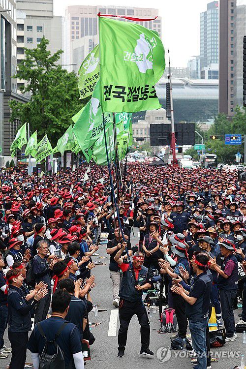 (서울=연합뉴스) 서대연 기자 = 26일 서울 중구 숭례문 일대에서 전국건설노동조합 건설노동자 2차 총궐기 대행진 마무리집회가 열리고 있다. 2025.6.26 dwise@yna.co.kr ▶제보는 카카오톡 okjebo ▶연합뉴스 앱 지금 바로 다운받기~ ▶네이버 연합뉴스 채널 구독하기 <저작권자(c) 연합뉴스, 무단 전재-재배포, AI 학습 및 활용 금지>