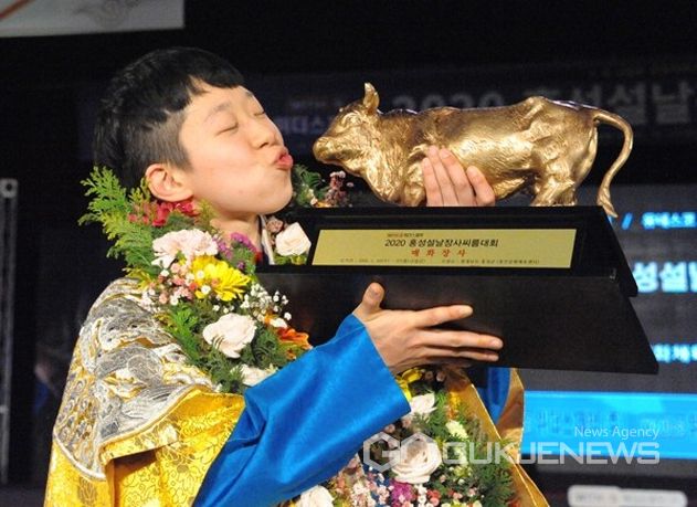 우승컵을 받아든 이아란 선수.사진=안산시 (안산=국제뉴스)이승환 기자=안산시는 시 직장운동부 이아란(24안산시청) 선수가 2020 홍성 설날장사 씨름대회에서 매화급 장사에 등극했다고 29일 밝혔다. 이아란 선수는 지난 27일 충남 홍성 홍주문화체육센터에서 열린 대회 마지막 날 여자부 매화급(60㎏급) 결승전에서 한유란(거제시청)을 2대 1로 꺾고 우승했다.