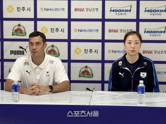 여자배구대표팀 모랄레스 감독과 박은진이 13일 경기를 마친 뒤 기자회견에 임하고 있다.진주 | 정다워 기자 페르난도 모랄레스 여자배구대표팀 감독이 풀세트 접전에 만족감을 드러냈다. 모랄레스 감독이 이끄는 여자배구대표팀은 13일 진주체육관에서 열린 프랑스와의 2025 코리아 인비테이셔널 진주 국제여자배구대회 두 번째 경기에서 세트스코어 2-3(8-25 25-