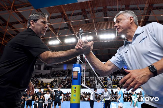 현대캐피탈 블랑(왼쪽) 감독과 대한항공 헤난 감독. 사진 | 한국배구연맹 “블로킹·수비 시스템 준비했다.”(대한항공 헤난 달 조토 감독) “첫 맞대결 때와 우리는 달라졌다.”(현대캐피탈 필립 블랑 감독) 대한항공과 현대캐피탈은 16일 인천계양체육관에서 진에어 2025~2026 V리그 남자부 3라운드 맞대결을 펼친다. 두 팀의 개막전은 국제배구연맹(FIVB)