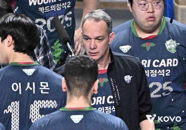 사진 | 한국배구연맹 “고비가 오면 패닉에 빠지는 듯한 느낌이 든다.” 마우리시오 파에스 감독이 이끄는 우리카드는 28일 장충체육관에서 열린 대한항공과 진에어 2025~2026 V리그 남자부 맞대결에서 세트 스코어 1-3(21-25 22-25 25-23 22-25)으로 패했다. 4연패 늪에 빠진 우리카드(승점 19)는 5위 OK저축은행(승점 24)을 추격하