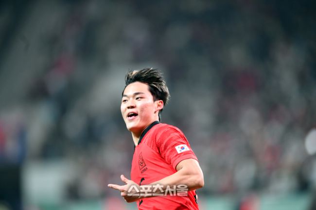 오현규가 28일 서울월드컵경기장에서 열린 대한민국과 우루과이대표팀과의 평가전 후반 동점골을 성공시킨 후 환호하고 있다. 하지만 아쉽게도 비디오판독으로 노골로 선언됐다.2023.03.28.상암 | 강영조기자 kanjo@sportsseoul.com 오현규(21·셀틱)가 ‘배움’에 대한 욕심을 가감없이 드러냈다. 오현규는 28일 서울월드컵경기장에서 열린 우루과이