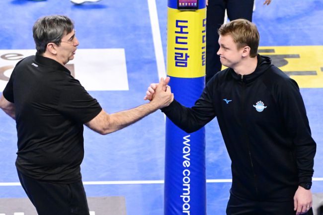 필립 블랑(왼쪽) 감독과 토미 틸리카이넨 감독. 사진 | 한국배구연맹 “전술, 비책보다는 처리 능력이 중요하다.”(대한항공 토미 틸리카이넨 감독) “플로터 서브 리시브 잘해야 한다.”(현대캐피탈 필립 블랑 감독) 현대캐피탈과 대한항공은 3일 천안유관순체육관에서 도드람 2024~2025 V리그 남자부 챔피언결정전 2차전을 치른다. 1차전은 현대캐피탈이 세트