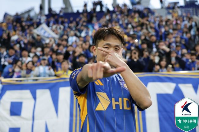 울산 강상우가 13일 대구전에서 승리한 뒤 자신의 시그니처 세리머니를 펼치고 있다. 사진 | 한국프로축구연맹 울산 HD 수비수 강상우(32)가 올 시즌 첫 공격 포인트를 적립했다. 김판곤 감독이 이끄는 울산은 13일 대구iM뱅크파크에서 열린 ‘하나은행 K리그1 2025’ 8라운드 대구FC와 맞대결에서 1-0으로 승리했다. 5경기 만에 승점 3을 확보한 울산