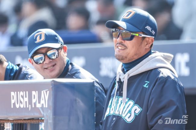 이호준 NC 감독(오른쪽)이 서재응 수석코치와 함께 더그아웃에서 밝게 미소 짓고 있다. 사진=NC다이노스 제공 지난해 10월, 프로야구 NC가 비어 있던 사령탑 자리에 굵직한 이름 석 자를 내밀었다. 꾸준히 하마평에 오르던 이호준 감독이었다. 선수시절 해태(현 KIA)-SK(현 SSG)를 거쳐 2013년부터 2017년까지 NC에서 활약했고, 2019~202